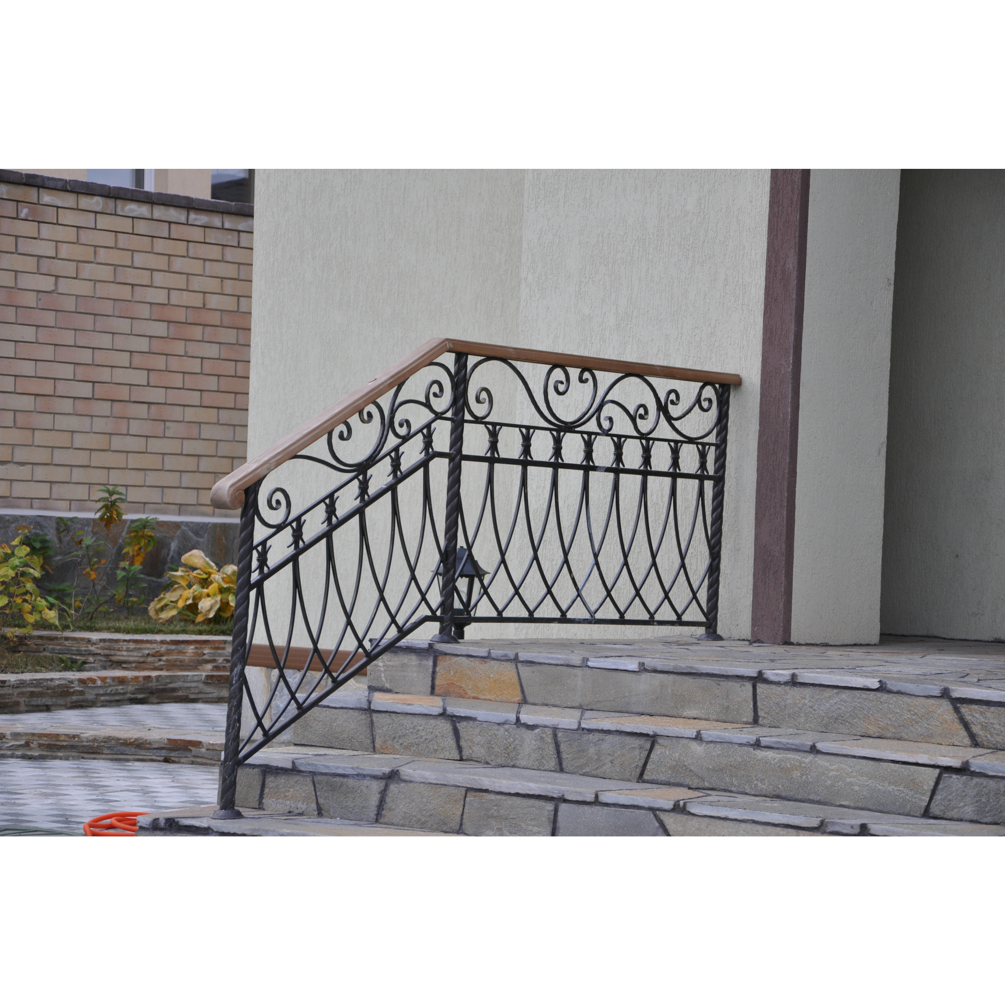 На данном фото перила исполнены из металла, витые стойки, поручень - древесина, цвет черный с патиной золото. Варианты исполнения поручня и стоек могут быть согласованны дополнительно, покраска под цвет интерьера. В стоимость м/п включён металлический поручень.Наличие