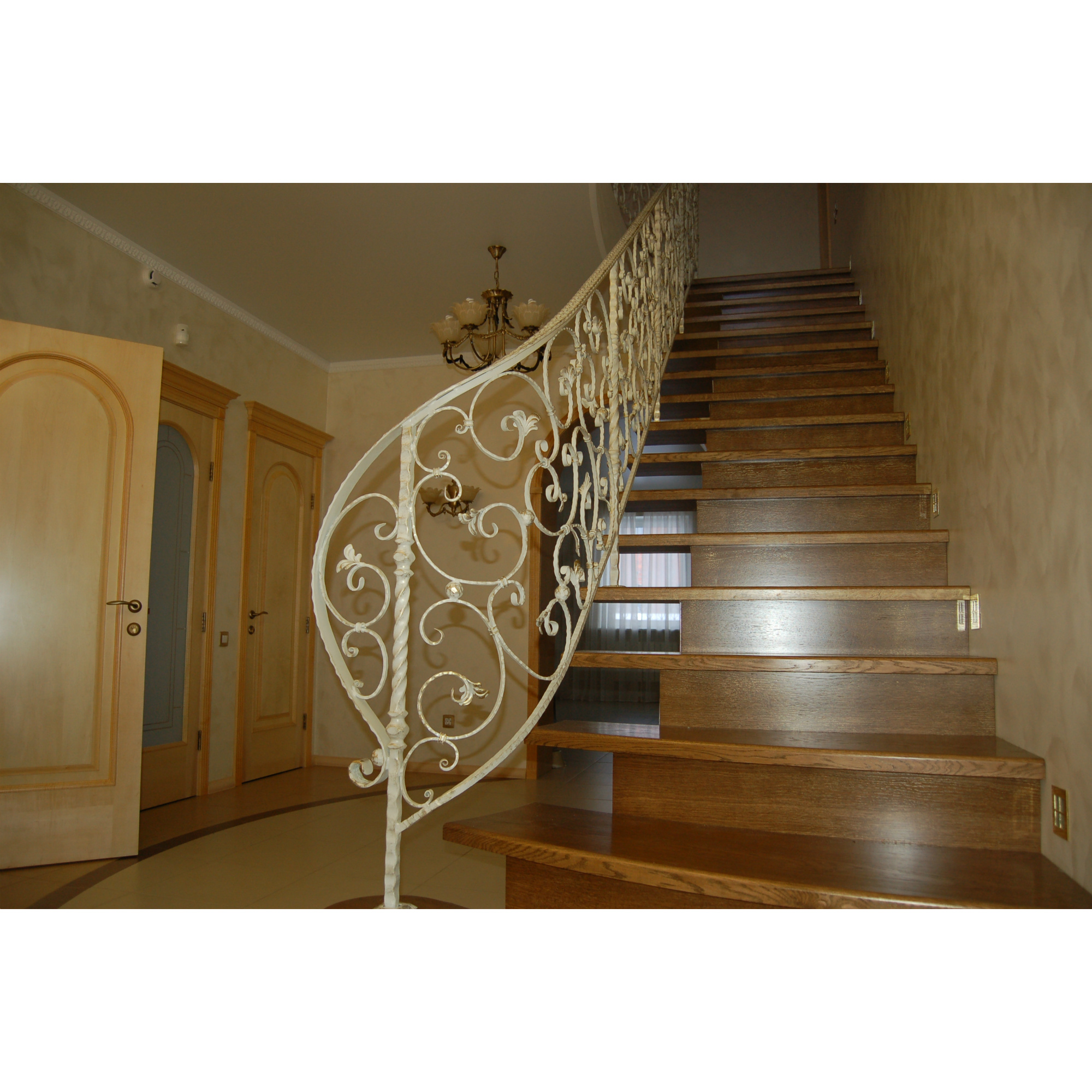 Перила выполнены из стандартных кованых элементов, но за счет декоративных стоек они выглядят воздушно и нежно одновременно.