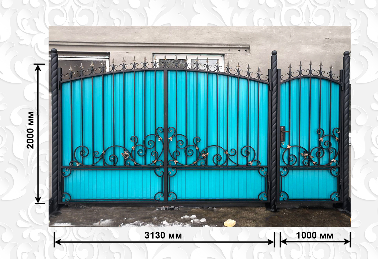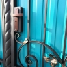 Каркас 40х20, кованые элементы, листочки кованые, покраска с патинированием, засов+упоры, шарниры, нащельник, профнастил цвет на выбор, 0,45 толщина, замок с ручкой "Гардиан"Наличие