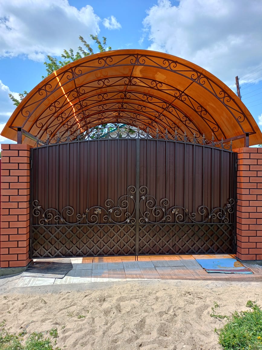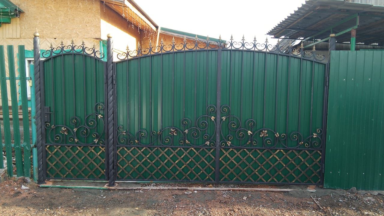 Каркас 40х20, кованые элементы, листочки кованые, покраска с патинированием, засов+упоры, шарниры, нащельник, профнастил цвет на выбор, 0,45 толщина, замок с ручкой "Гардиан"Наличие