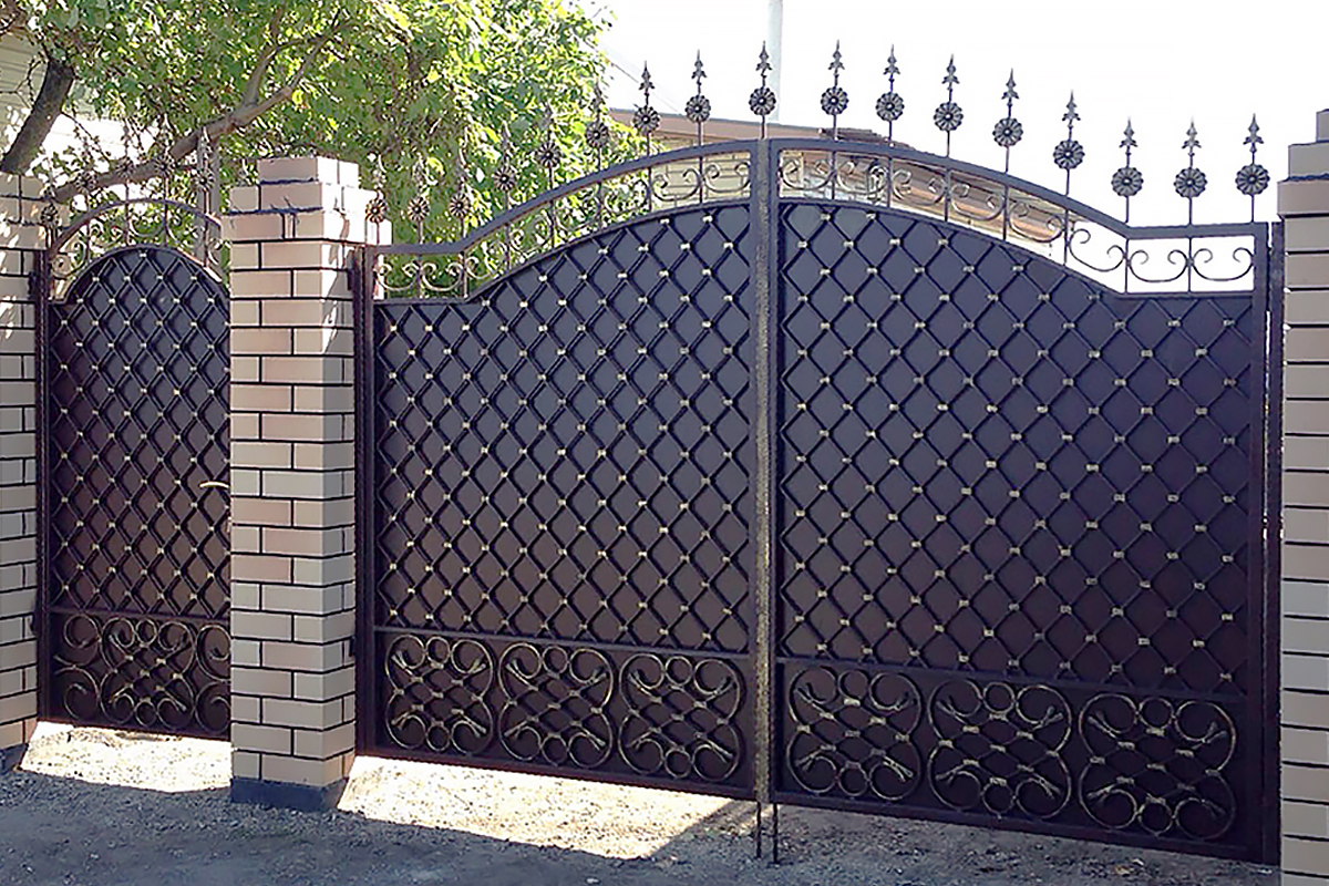 *Каркас- профиль ус. 40х40 , 40х20 *Наполнение- профиль 10х10, 15х15 *Кованые элементы- профиль 10х10 * Наполнение лист стальной t=2 мм *Шарниры усиленные *засов в середине + внизуНаличие